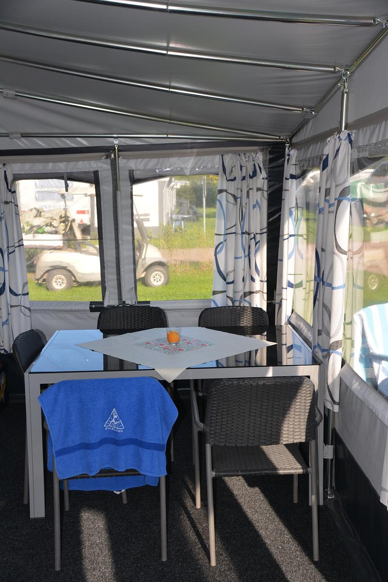 Das Vorzelt ist funktional ausgestattet und bietet ausreichend Platz zum Kochen sowie zum gemeinsamen Verweilen. Die Sanitäranlagen des Campingplatzes befinden sich in unmittelbarer Nähe. Ein Sitzbereich im Außenbereich lädt zum Entspannen an der frischen Luft ein.