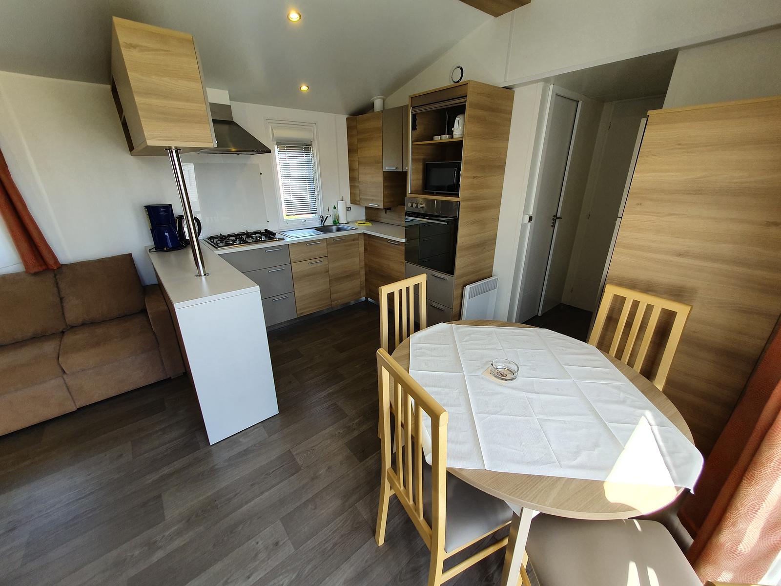Das Mobilheim verfügt über ein komfortables Schlafzimmer mit begehbarem Kleiderschrank (Walk-in-Closet)sowie ein separates Kinderzimmer. Die voll ausgestattete Küche mit Backofen ermöglicht eine flexible und komfortable Selbstverpflegung während Ihres Urlaubs.